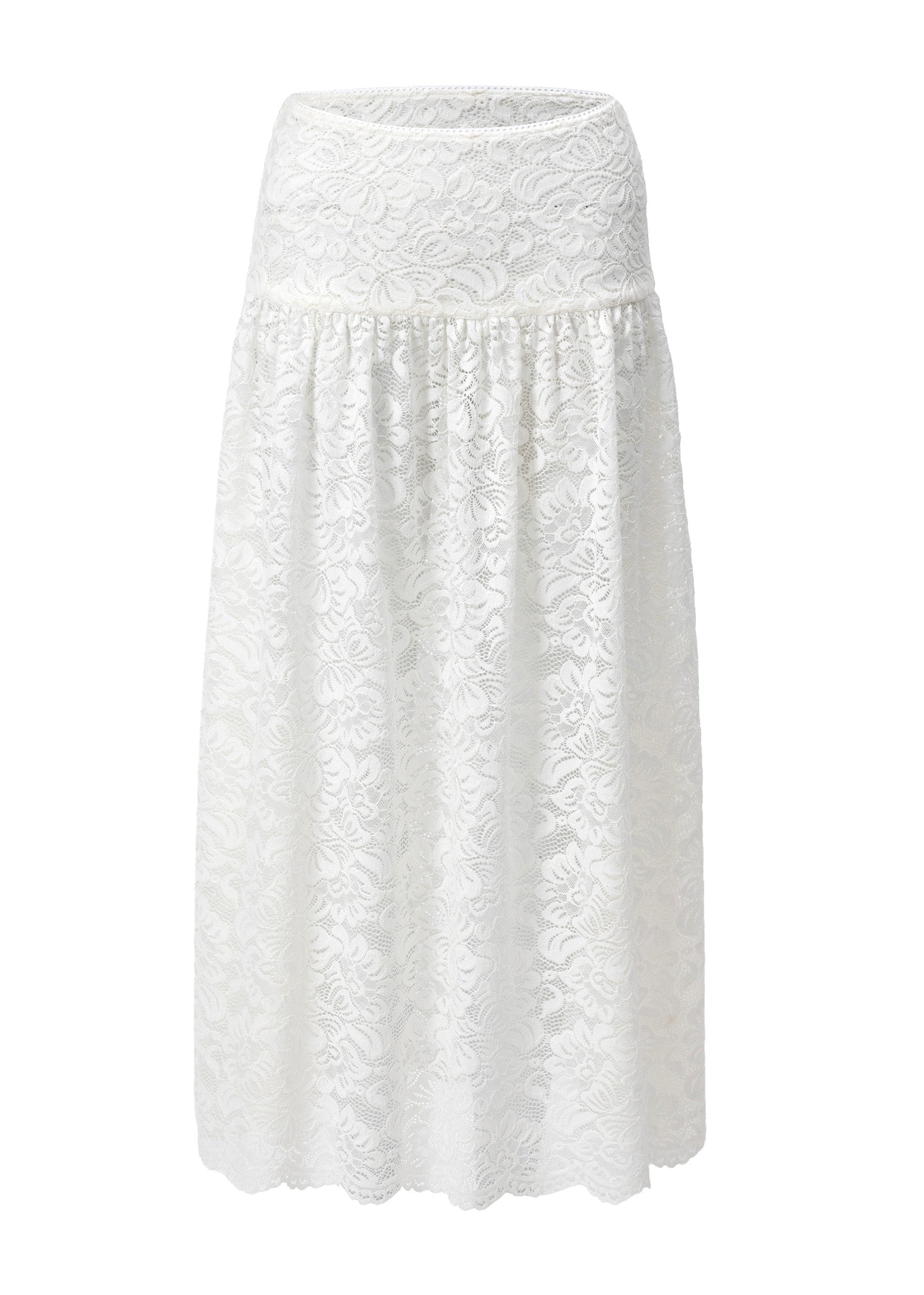 Midi lace skirt in a soft white tone featuring a rich floral pattern for a romantic, feminine feel. The wide, flattering waistband defines the waist, while the fabric flows effortlessly from the hips down with subtle volume and natural movement. Sheer lace layers create depth and texture, finished with a delicate scalloped hem for an elegant touch. A timeless statement piece perfect for summer events, vacations, or an elevated evening look.