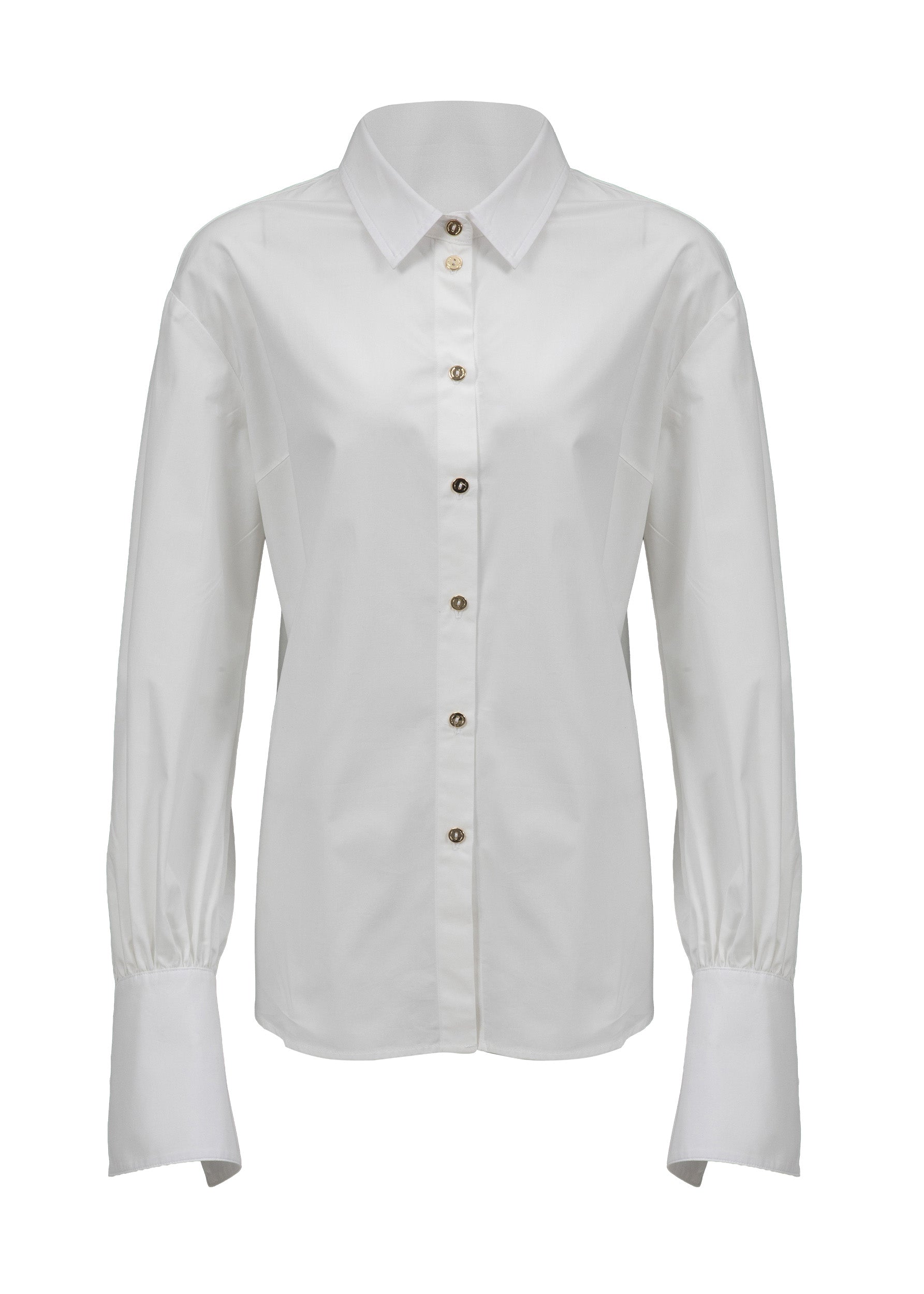 White tailored shirt with a feminine, modern twist. The wrap-style front creates a flattering neckline and defines the waist, complemented by a classic collar and subtle gold-tone buttons. The long sleeves feature soft volume and structured cuffs, adding elegance and sophistication. A timeless piece that blends classic tailoring with a contemporary edge.