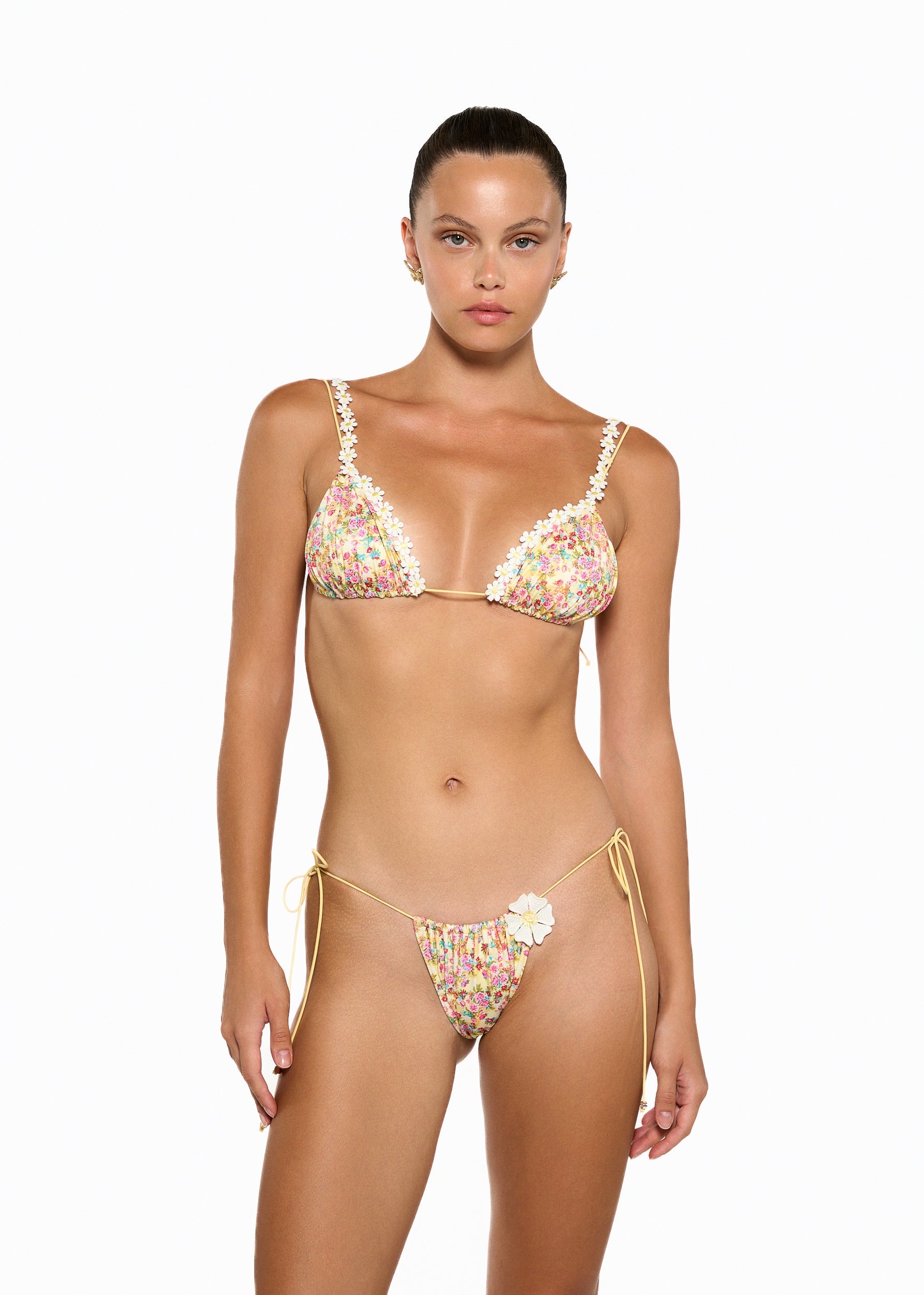 The ORCA bikini set has a playful and feminine charm with its floral print and delicate detailing. The top is a triangle bralette with dainty floral appliqués along the straps, adding a romantic touch, while adjustable ties ensure a comfortable fit.